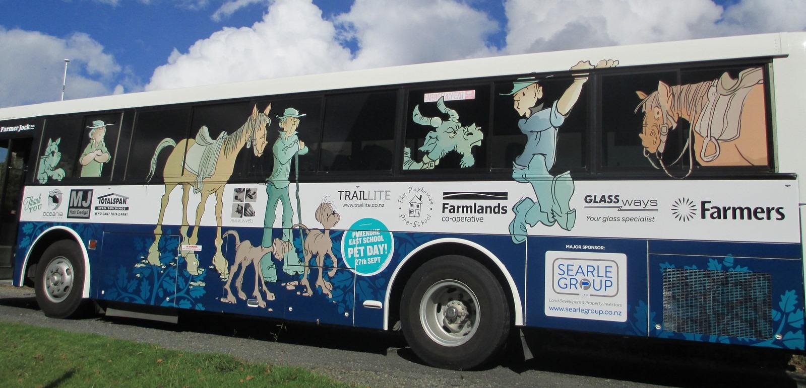 David Henshaw’s Farmer Jock cartoon characters, bigger than they’ve ever been seen before, proudly adorn the Pukekohe East School bus. It’s the world’s first and only Farmer Jock Bus.