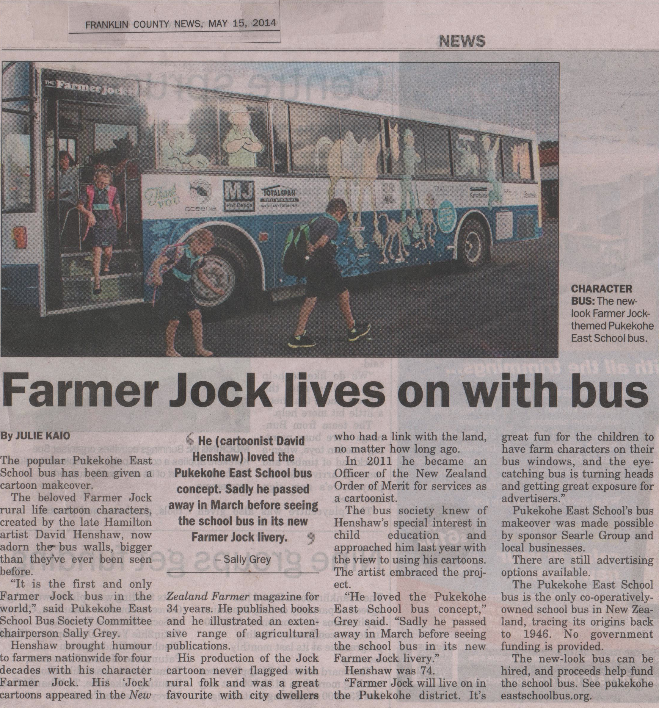 The late David Henshaw brought humour to farmers nationwide for four decades with his character Farmer Jock. His ‘Jock’ cartoons appeared in the New Zealand Farmer magazine for 34 years, he published books and he illustrated an extensive range of agricultural publications. In 2011 he became an Officer of the New Zealand Order of Merit. Read Franklin County News’ article Farmer Jock Lives on with Bus.