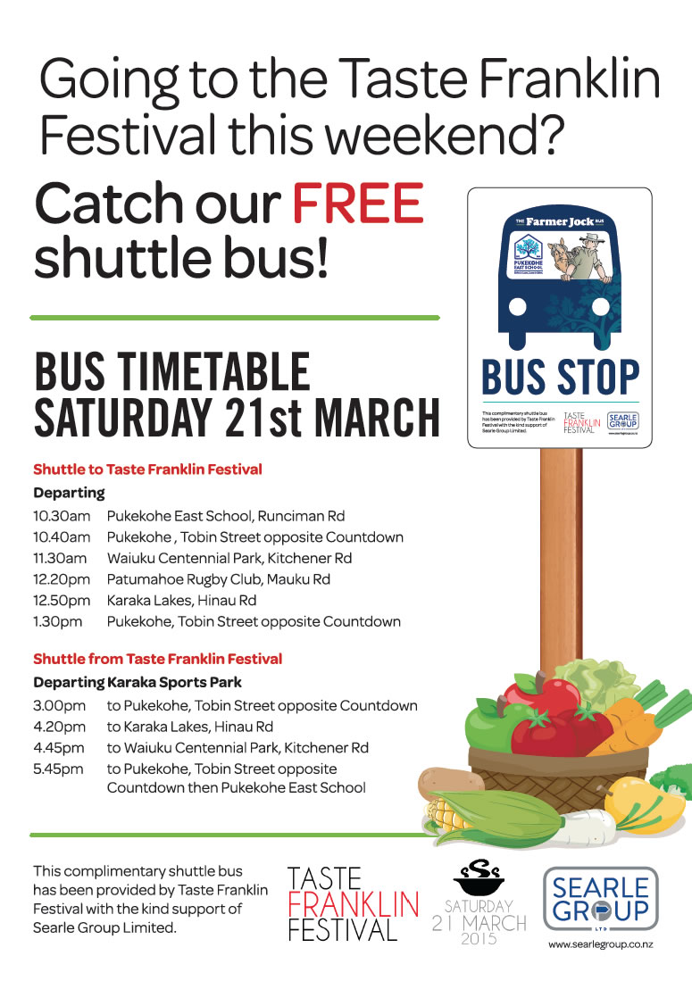 The Pukekohe East School Bus Society would like to thank Searle Group for its sponsorship to enable the Taste Franklin Festival organisers to employ our bus as their official shuttle.